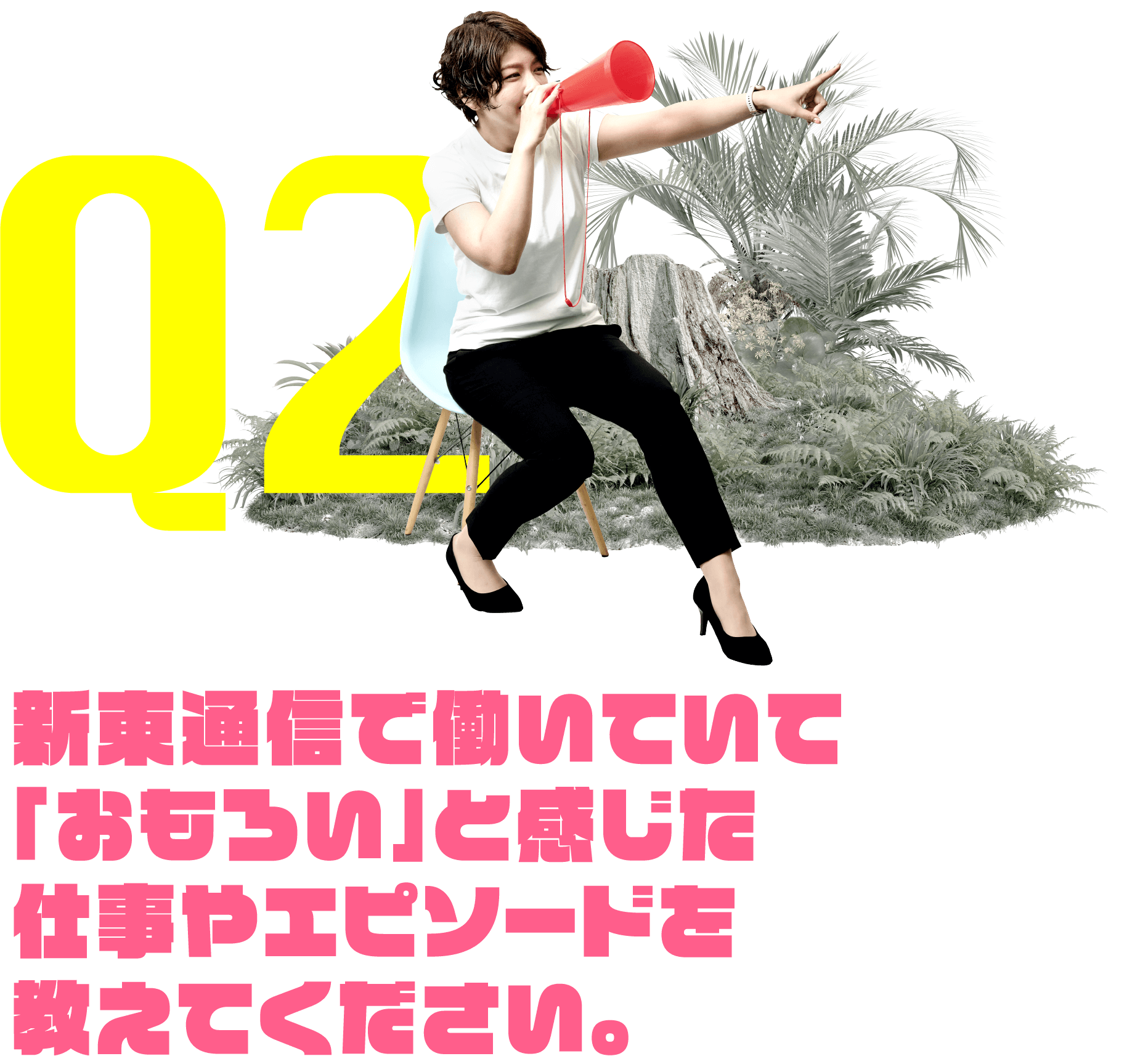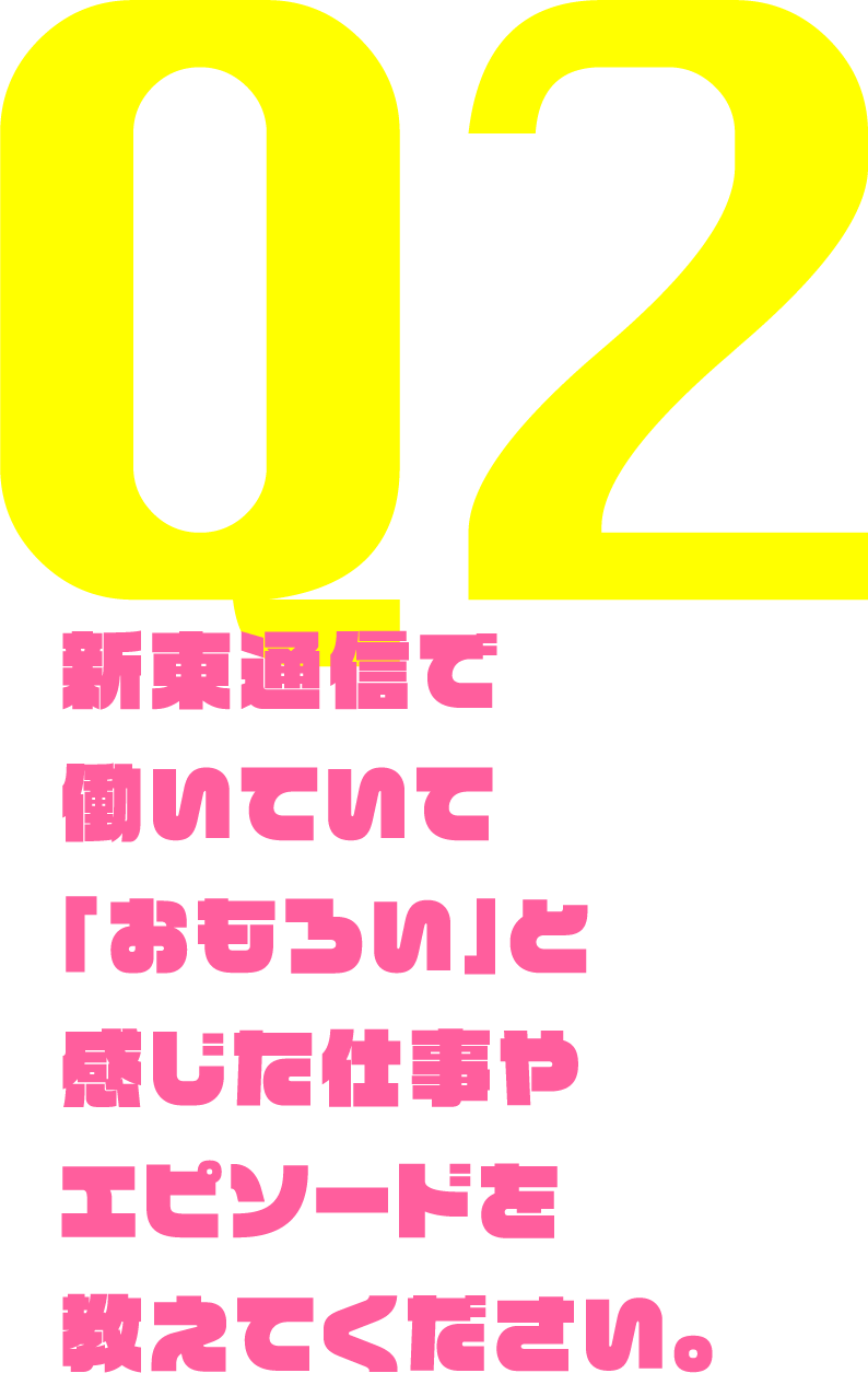 とあるインフラ会社のWEB上での会員獲得キャンペーン及びコンテンツ制作を、半年かけて⾏った経験はとても勉強になった案件です。また、前職からお世話になっていたクライアントの本社のCMコンペに出場・獲得出来たことも嬉しかったです。様々な分野のプロフェッショナルが当社内にいるので、みんなで⼒を合わせて作り上げていく事が出来るのがおもしろく楽しいです。⾃分のグループを持つようになってからは、新卒の⼦を含んだ若⼿チームを運営し、毎⽇知らないことだらけの新⼈たちと切磋琢磨しながら過ごすのが腹⽴たしく「おもろい」⽇々です。新⼈賞を当グループの⼥⼦が獲ったんです!すごい!嬉しい。